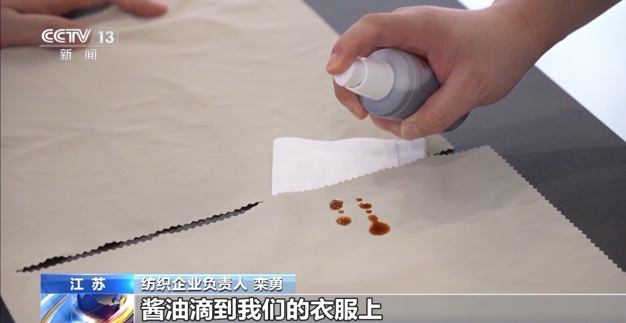 纺织企业负责人 栾勇:这个是我们前两天刚研发出来的,酱油滴到我们的衣服上很快会散开,然后我们用清水冲洗一下,很快就会散掉。