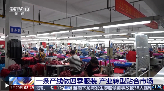 记者来到浙江的这家服装生产企业,发现此时此刻,一条生产线上做着各种不同季节、不同类型的服装。从销往欧洲的双面棉服,到零静电功能的T恤;有卖到新疆的套装,可以满足早晚温差,也有卖到东北的滑雪服和广东、广西等湿度较大地区的速干衣。