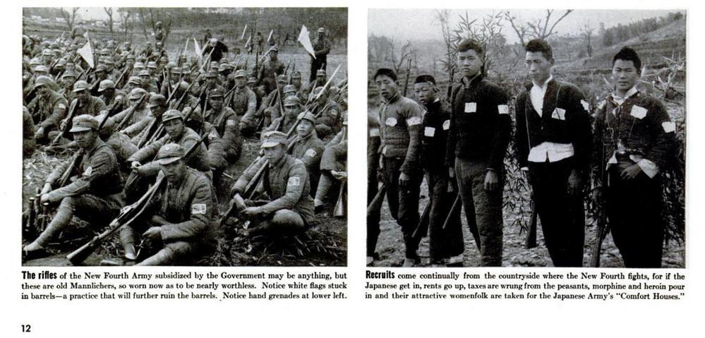 这是1939年7月出版的美国《生活》杂志第12页影印件局部,展示了史沫特莱拍摄的新四军的一些画面。左图:新四军的装备较为简陋;右图:新四军从作战的农村地区招募新兵。