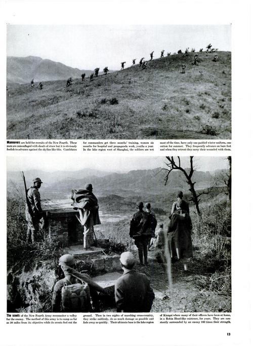 这是1939年7月出版的美国《生活》杂志第13页影印件,展示了史沫特莱拍摄的新四军训练和侦察的一些画面。上图:新四军的新兵们开展战术训练;下图:新四军的侦察小队正在山谷中执行敌情侦察任务。