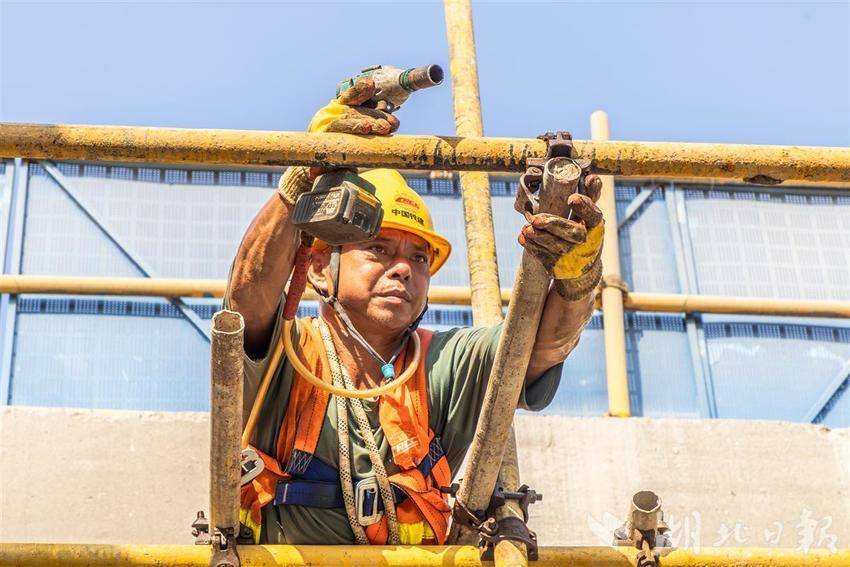 建设者在企业服务中心大楼建设现场安装脚手架。