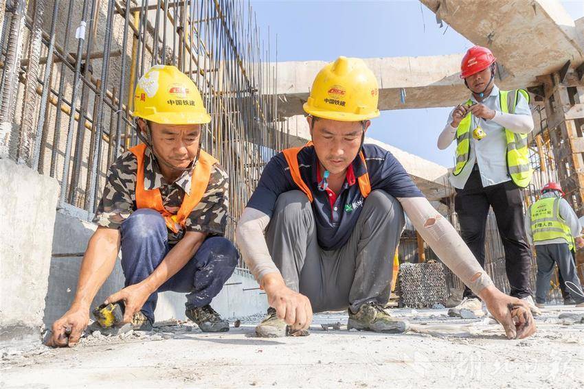 建设者在企业服务中心大楼基坑内弹线标记钢筋安装位置。