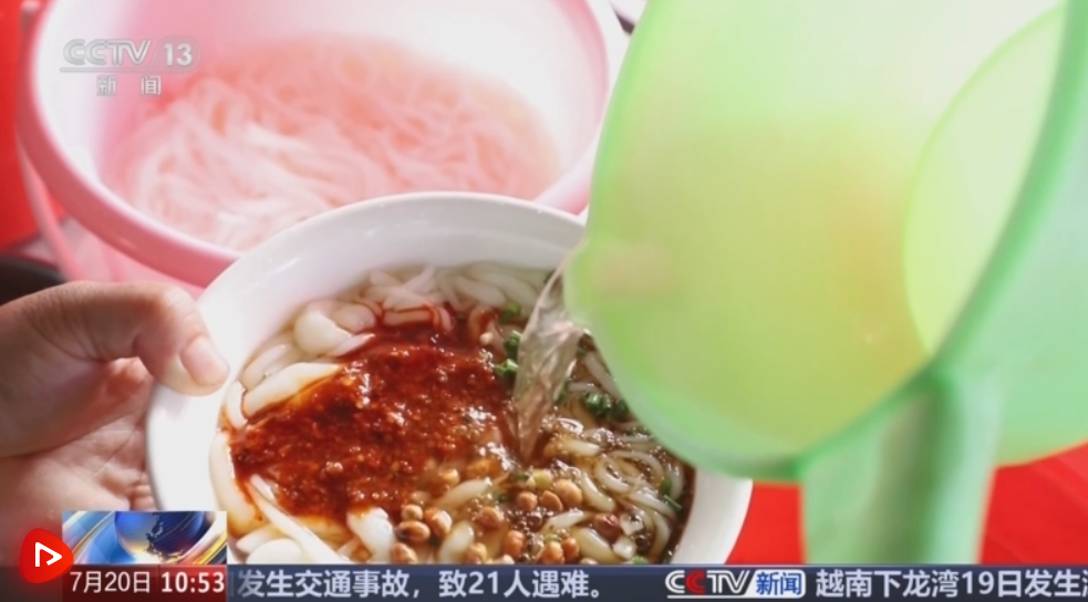 炉火持续加热时,要不停搅拌锅中的米浆,这个环节至少要坚持半小时。最后,滚烫的米浆通过特制漏斗淋入凉水中,瞬间凝固成细条状,在水中摆动时像一群游动的小虾。吃的时候舀入冰镇酸水,淋上秘制辣椒,撒把炒得香脆的黄豆,一碗消暑佳品就成了。