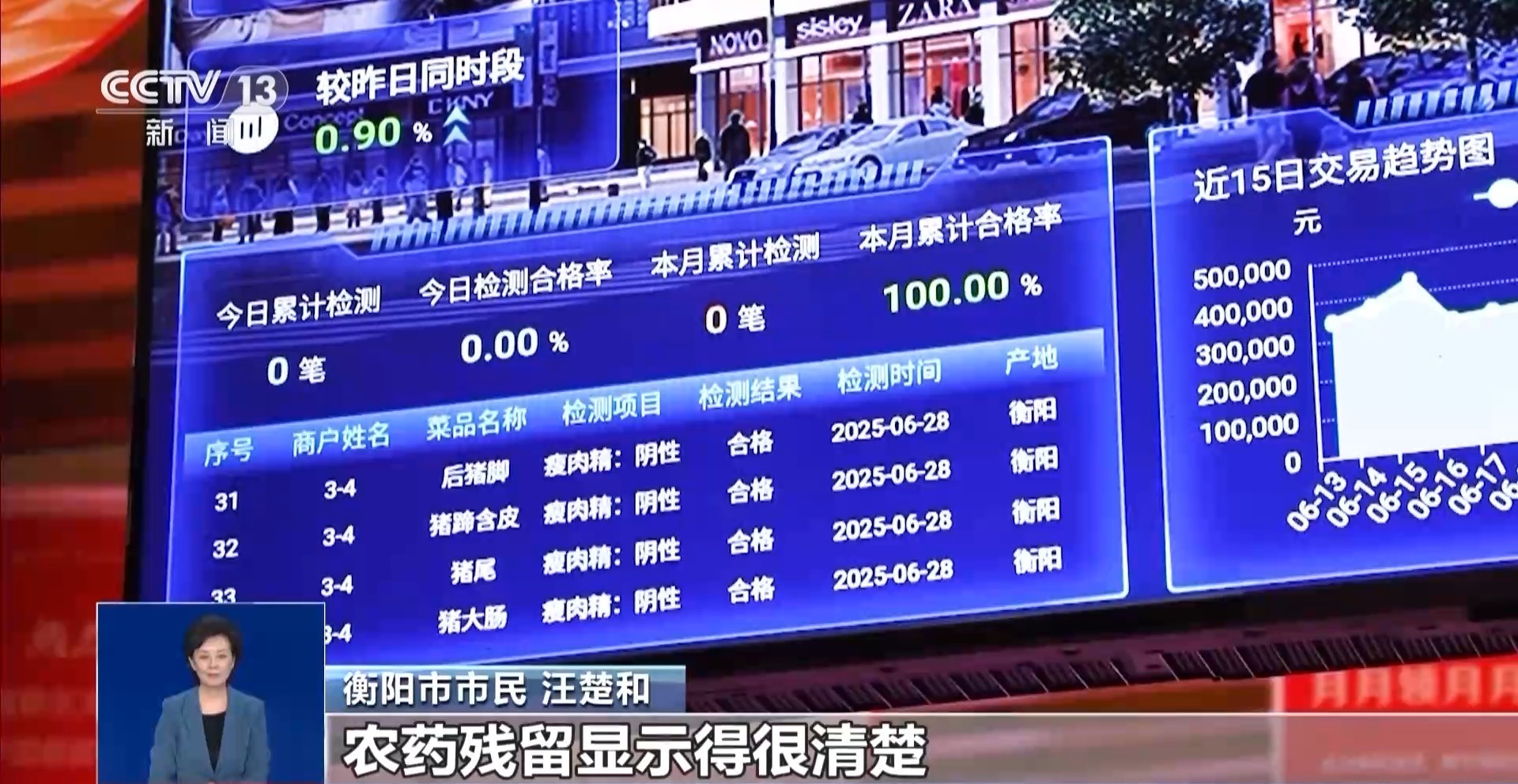 衡阳市市民 汪楚和:菜市场满足了我们的需求,每种价格都公布在大屏幕上,一目了然。青瓜蔬菜的农药残留显示得很清楚,我很放心。