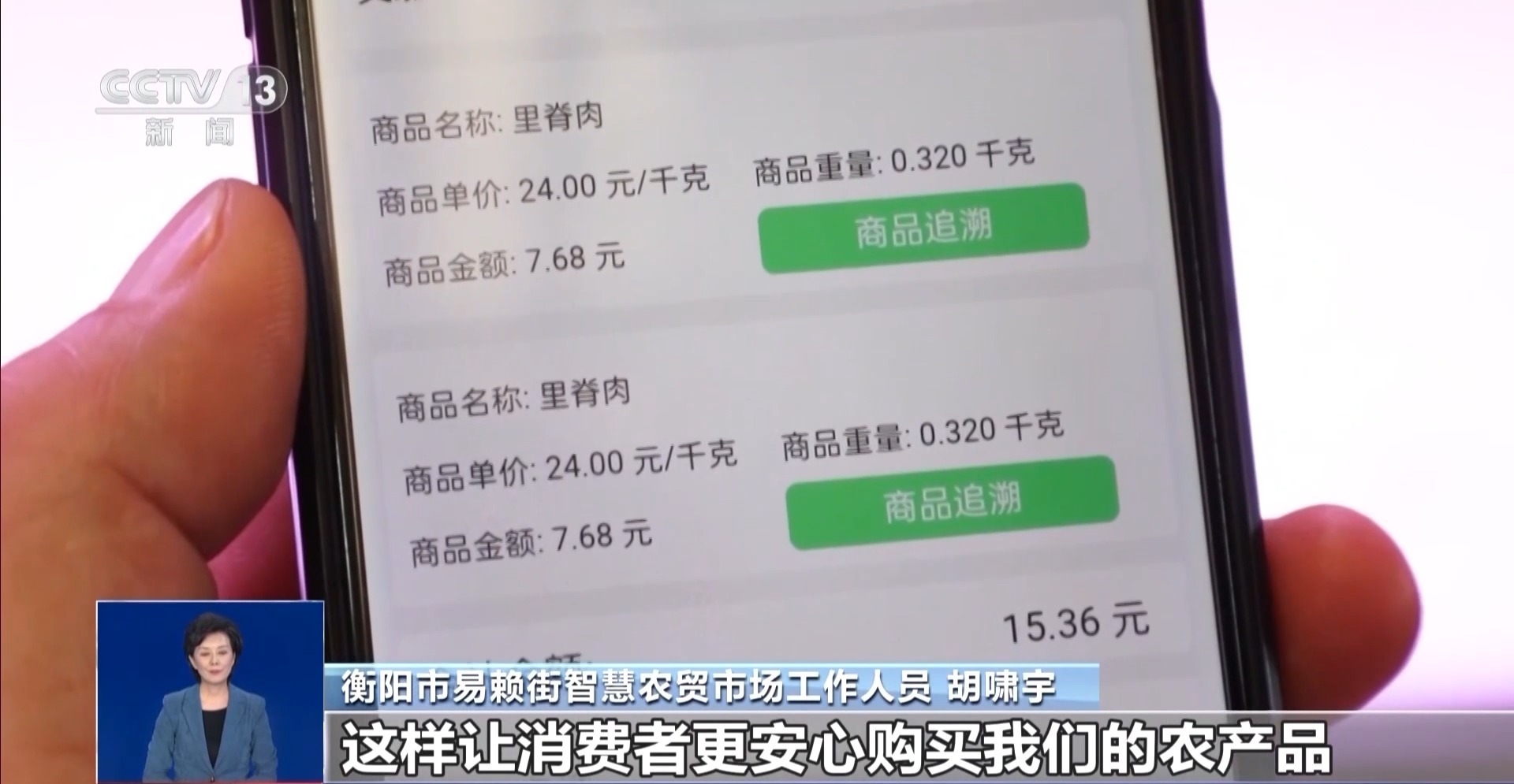 衡阳市易赖街智慧农贸市场工作人员 胡啸宇:消费者去摊位买农产品会生成一个小票的二维码,可以直接溯源到农产品出厂地到摊位的全流程的监管,这样让消费者安心地购买我们的农产品。