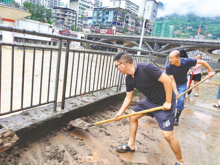 6月21日,关红翔(前)参与汛后清淤行动。(受访单位供图)