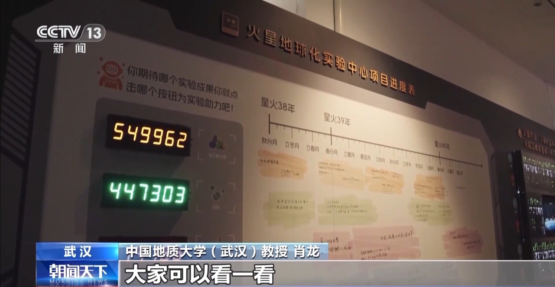 中国地质大学(武汉)教授 肖龙:比如说我们去了火星,我们吃什么、喝什么,火星的土壤能不能种庄稼,我们科学家有些实验,这里有实物展示,大家可以看一看。
