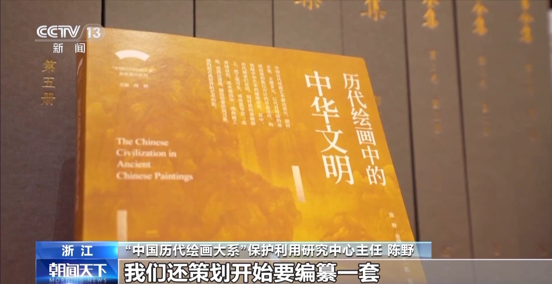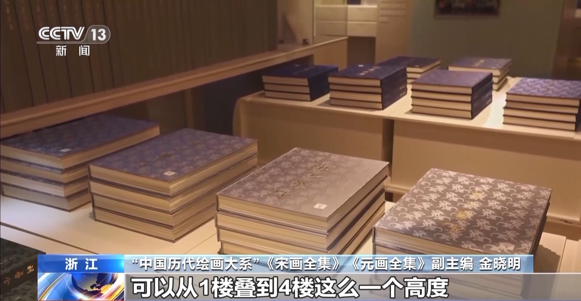 “中国历代绘画大系”《宋画全集》《元画全集》副主编 金晓明:每一本书的体量非常大,如果把它叠起来,可以有从1楼叠到4楼高。我们当时编纂的初心,叫作“飞入寻常百姓家”,老百姓可以通过“中国历代绘画大系”去了解2000多年来我们中国传统绘画的发展脉络、文明的发展历程。