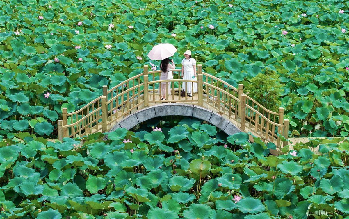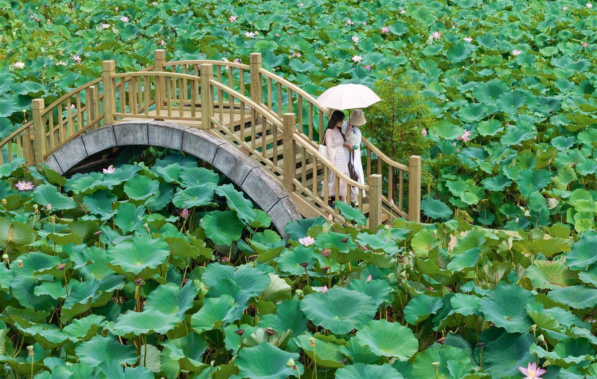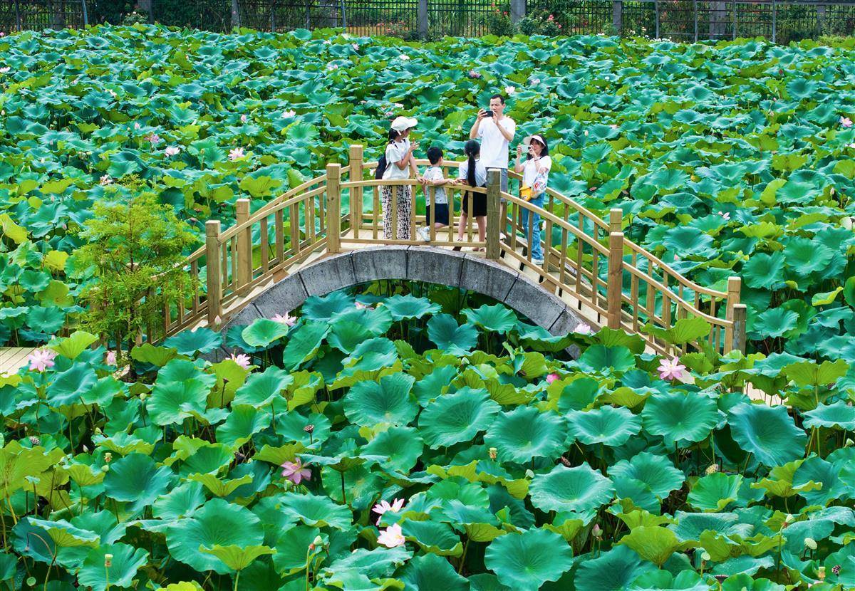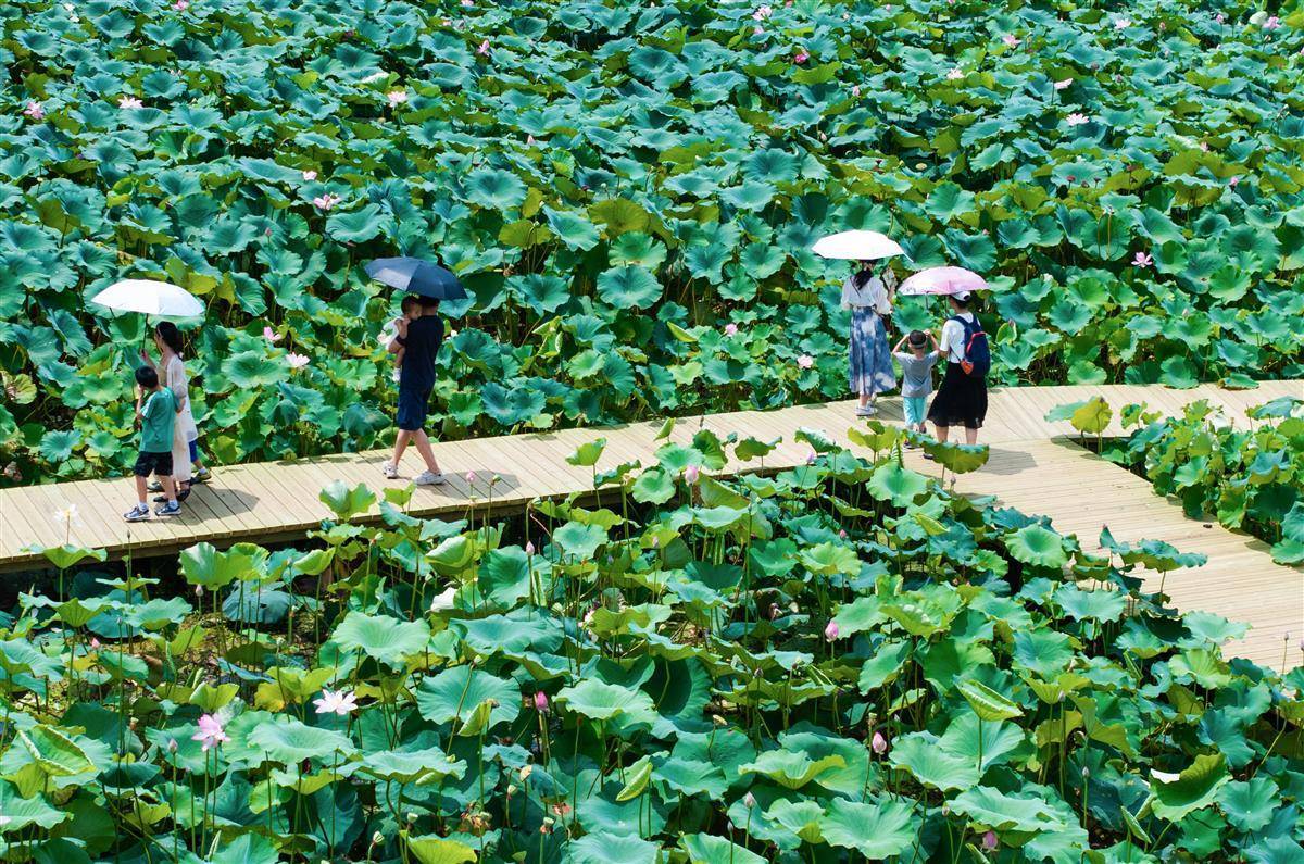 7月12日,武汉植物园荷花盛放,约16000平方米展示区里,200余种荷花亭亭玉立。游客穿梭其中,沉醉于“接天莲叶无穷碧”的夏日美景。(湖北日报全媒记者 薛婷 摄)