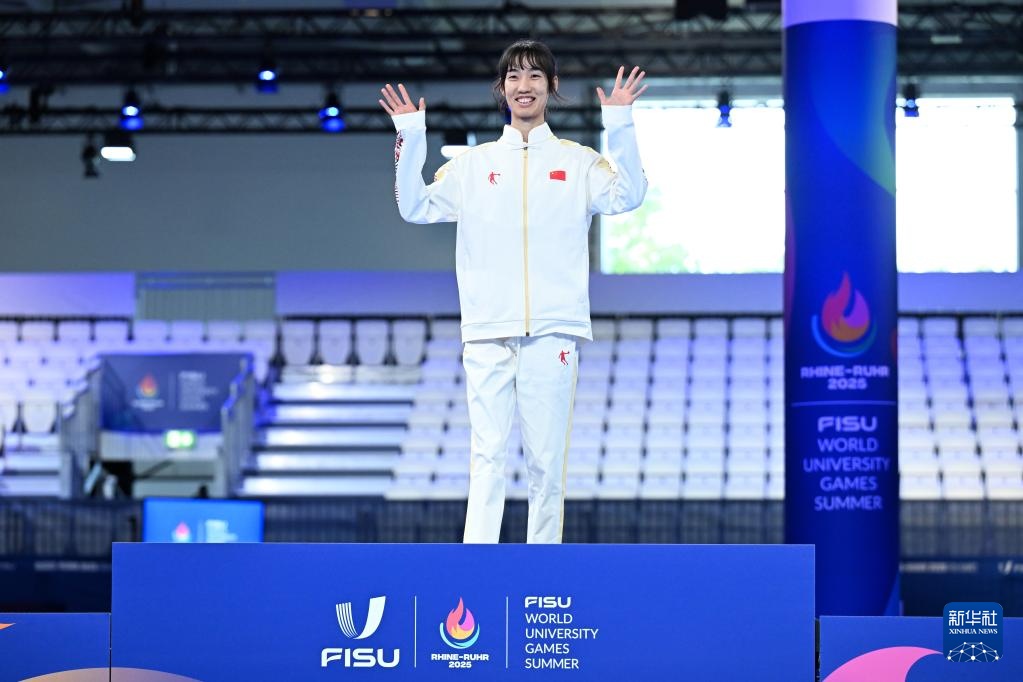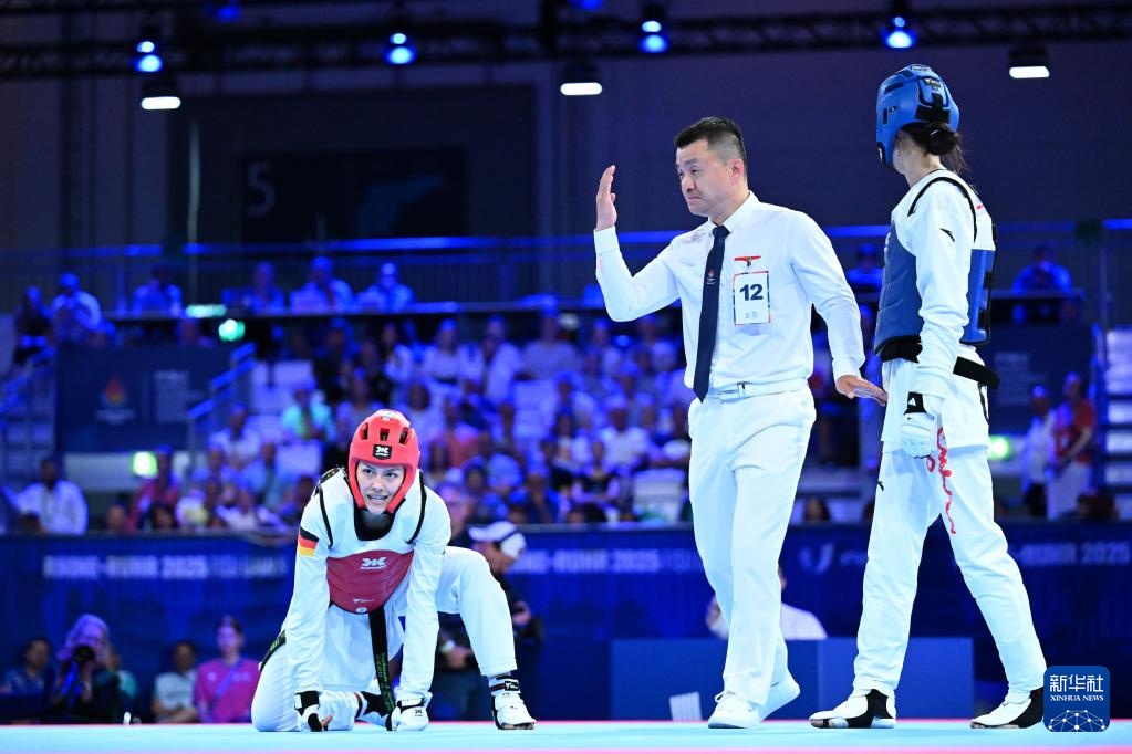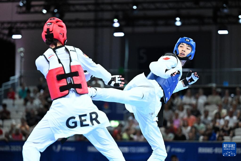 当日,在德国埃森举行的2025年莱茵-鲁尔世界大学生夏季运动会跆拳道女子49公斤级决赛中,中国选手马静月战胜德国队选手基斯卡尔特,获得金牌。