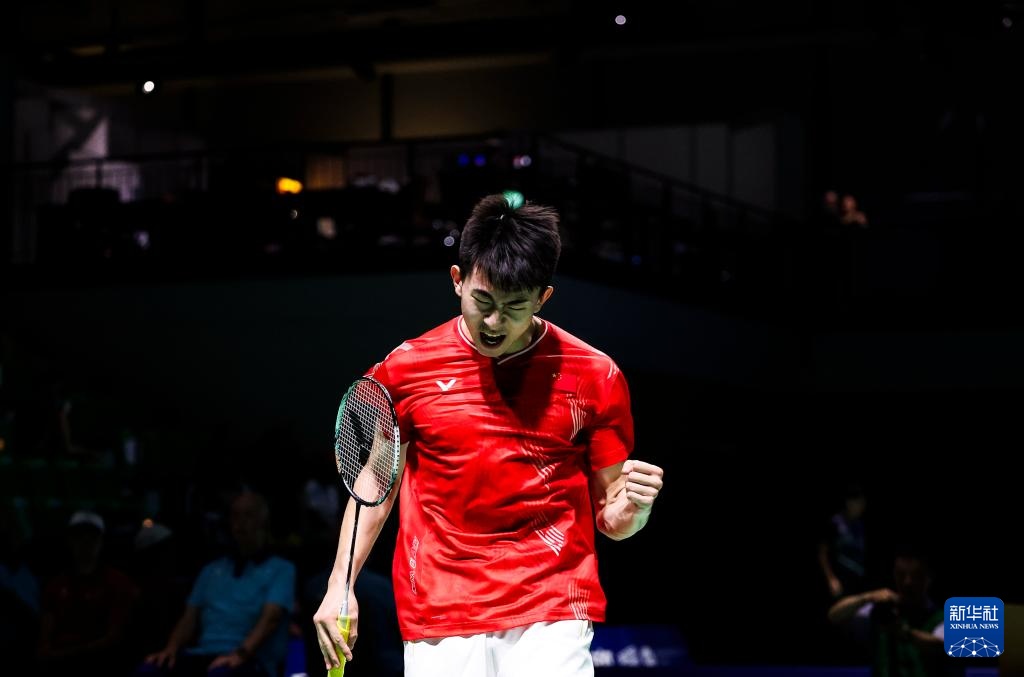 7月20日,中国队选手王子峻在男单比赛中庆祝得分。新华社记者 胡星宇 摄