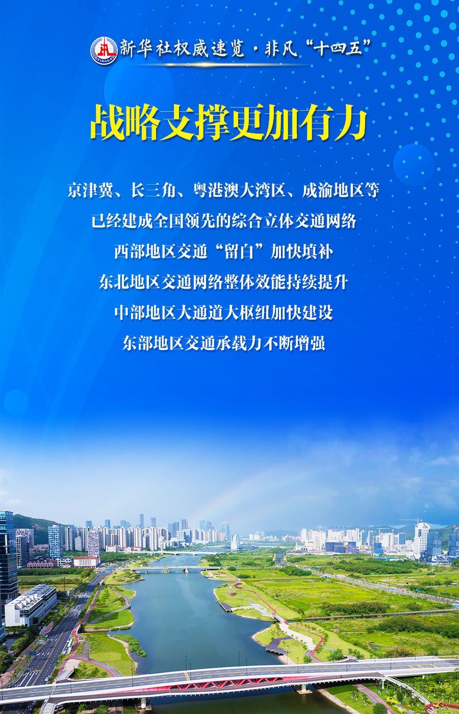 “十四五”时期,我国加快建设交通强国实现良好开局。在21日举行的“高质量完成‘十四五’规划”发布会上,交通运输部部长刘伟说,这五年,我国交通运输事业取得了历史性成就,综合交通运输体系建设实现突破性进展。这组海报,带你去看。