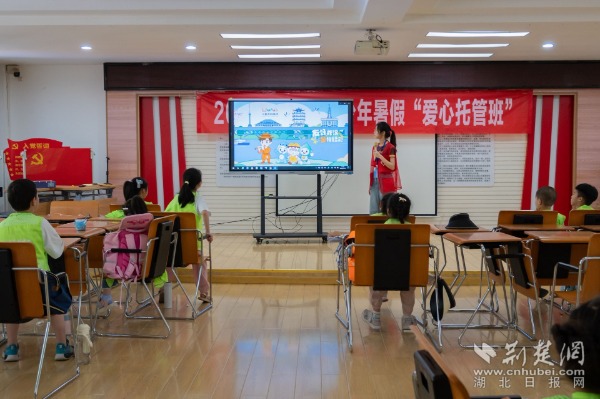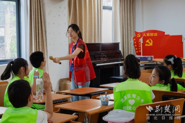 志愿者为青少年介绍武汉市儿童友好城市形象标识。 通讯员供图