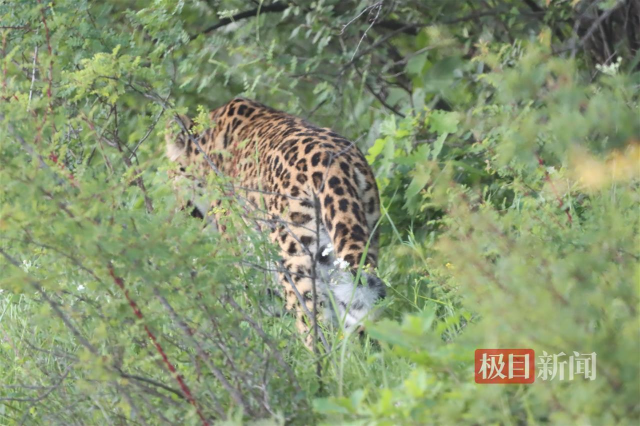 近日,多个网络视频显示,山西沁源县一村民在回家途中,偶遇一只华北豹。7月21日,当事村民刘先生告诉极目新闻记者,当时豹子扭头和自己对视了一眼,然后淡定地走向山林。