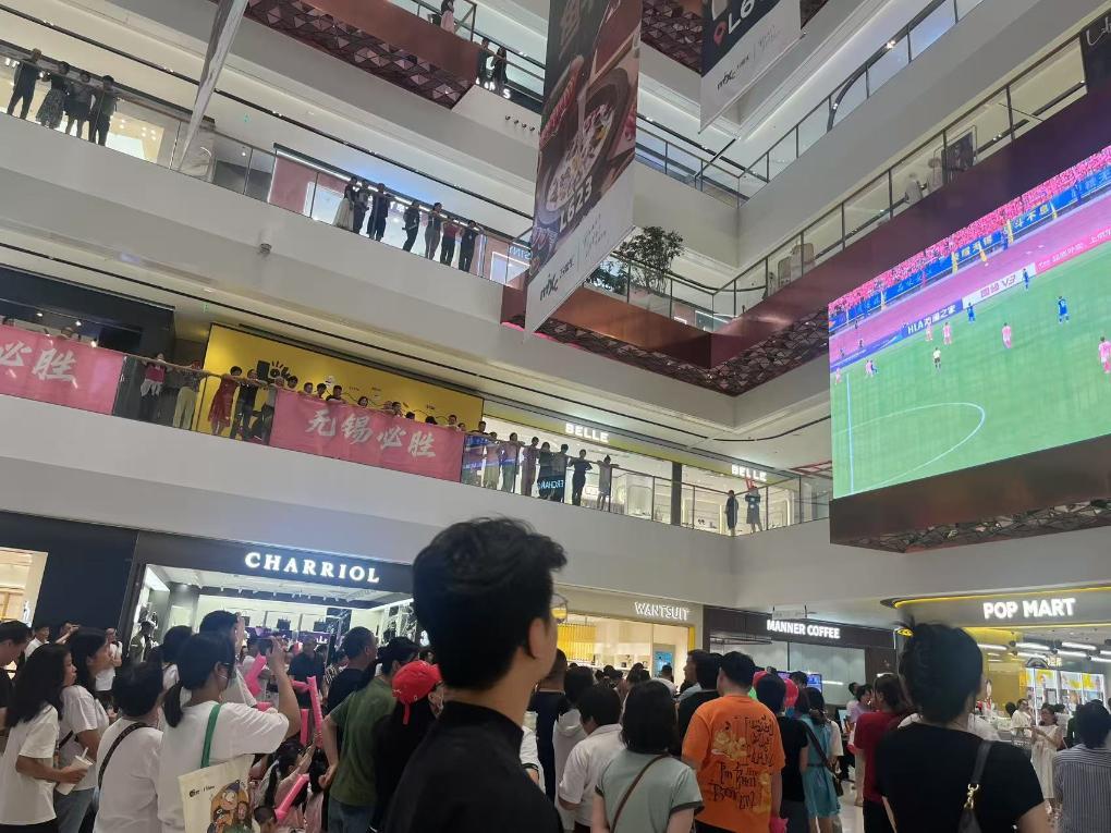 在位于无锡市滨湖区的一家商场内,顾客正在大屏下观看“苏超”比赛。新华社记者 何磊静 摄
