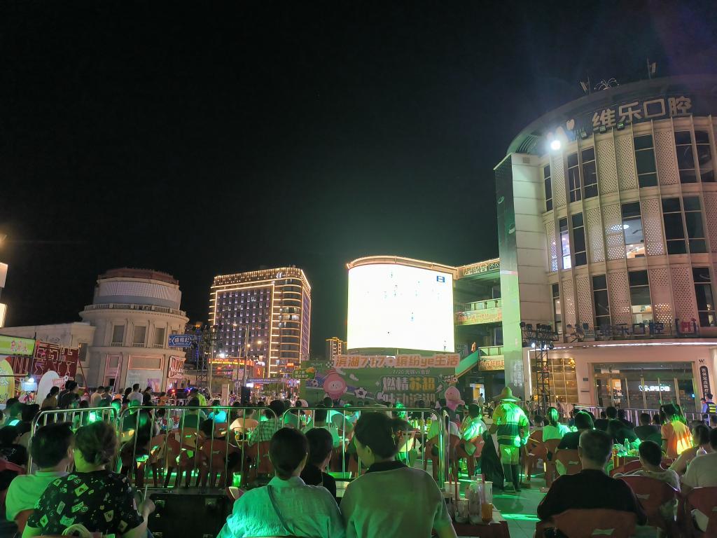 在位于无锡市滨湖区的湖滨商业街东广场,人们边看球边品尝美食。新华社记者 何磊静 摄
