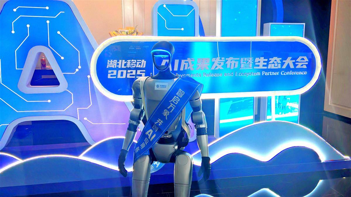 人形机器人亮相2025年湖北移动人工智能成果发布会。(记者刘天纵摄)