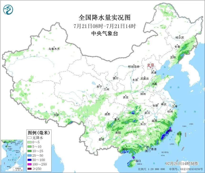 其中,台风本体给广西南部、广东西南部、海南西部和北部等地带来强降雨,台风东侧结合季风气流给浙江东南部、福建东部、广东东部等地带来强降雨,此外台风北侧倒槽也使得贵州、湖南西北部、湖北西部一带有强降雨出现。福建沿海一带的降雨量甚至超过了广西、海南,像是福建长乐,08时至14时累计降雨达138.4毫米。