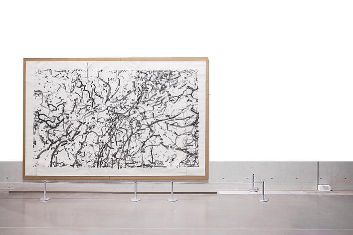 这幅空白的卷轴是艺术家翟一涛的作品,名为《移动的山水》,它看似空白,却并非空无一物。据他介绍,这幅卷轴是他在川西一个海拔4000米的冰湖上拓印的作品。“这幅长卷你看它是没有痕迹的,但它其实是有痕迹的,痕迹已经发生了。”空白的卷轴就好似中国哲学里“空”的概念,似有还无,给人留下无尽的遐想。