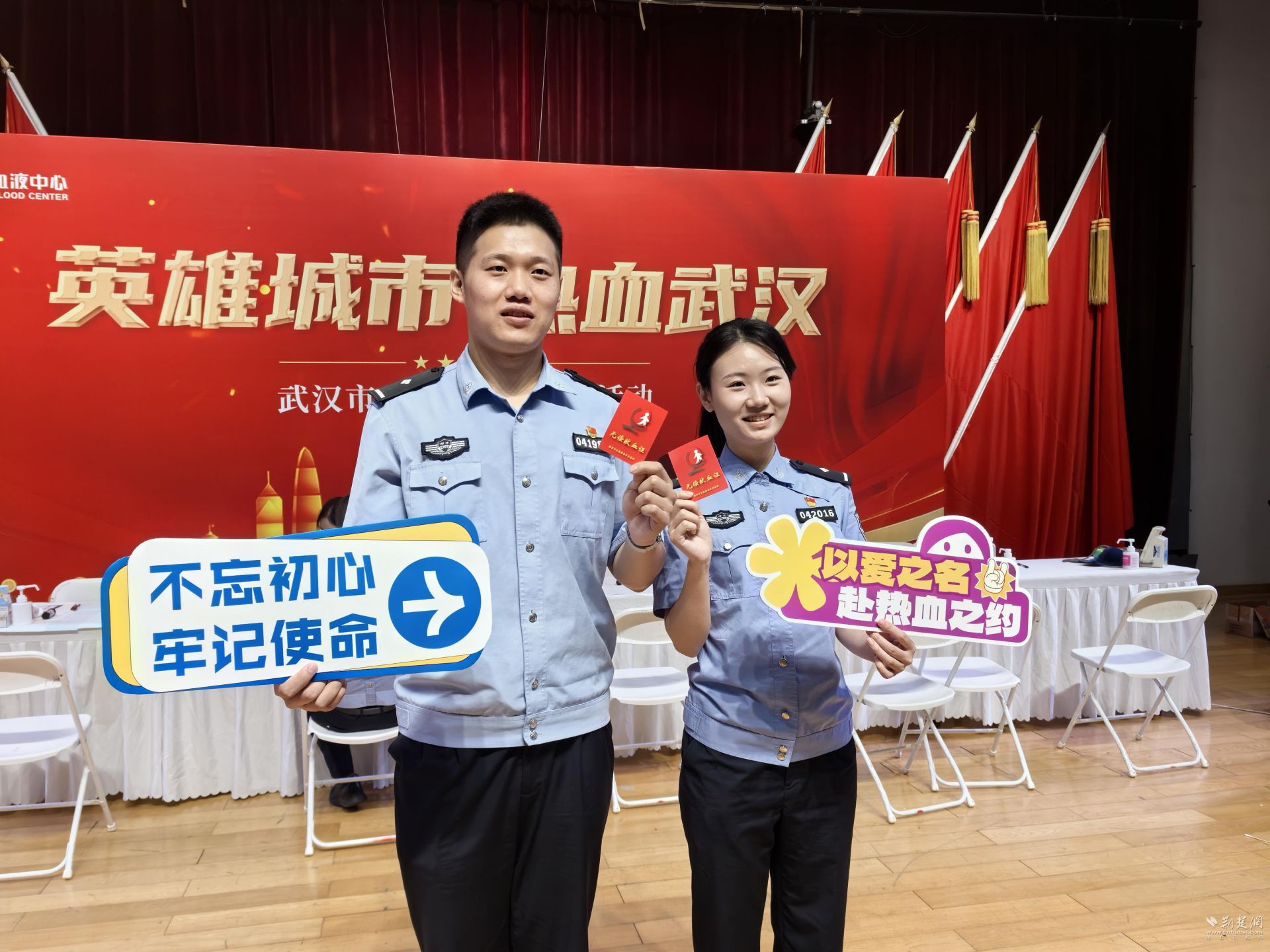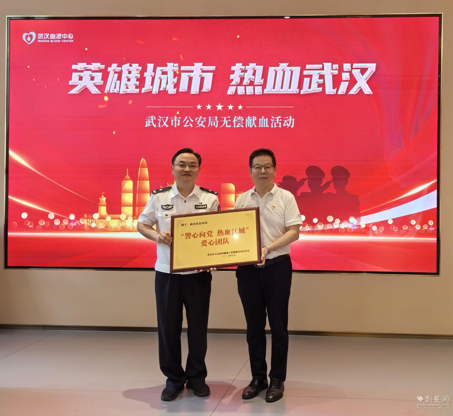 在献血活动的现场,武汉血液中心向武汉市公安局颁发了“无偿献血爱心团队”奖牌。