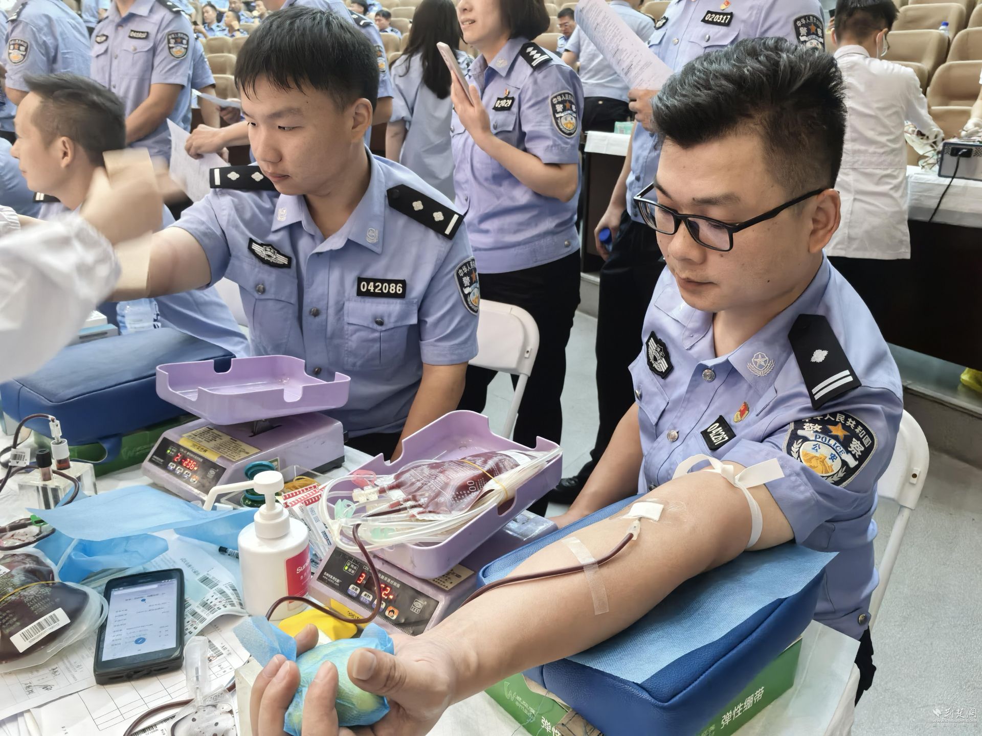 上午9时,在市公安局指挥大楼301会议室内,来自特警、监管、轨道等单位的民警辅警们挽起袖子,登记信息、测量血压、进行血液初筛。符合条件的民警辅警依次坐到采血椅上,鲜红的热血顺着导管缓缓流入储血袋。轨道交通管理分局民警周延龙第一次献血,看着血袋的导管,他坦言有点紧张,但想到自己的血液能治病救人,便不再害怕。当天,他从经开区汉纱派出所乘坐近2个小时的地铁专程赶来献血。