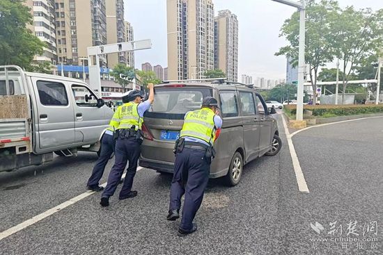 针对暑期和旅游旺季车流人流高峰,交警部门定点定岗设置警力,加强早中晚高峰期指挥疏导和动态巡逻,提升路面见警率、管事率,打造全时空、全覆盖勤务机制。高温天行车易发故障,交警随时准备应急救援。面对抛锚车辆,民辅警不顾车皮滚烫,合力推车转移,保障道路畅通。