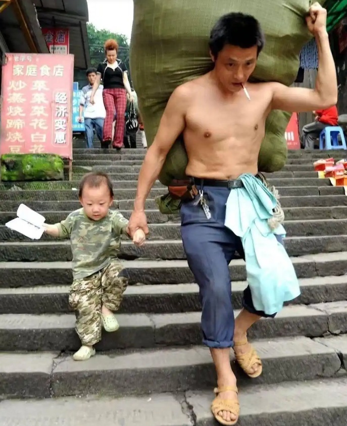 还有重庆朝天门的梯坎上,“棒棒”冉光辉扛着200多斤货物的身影。15年前,他牵着3岁的儿子沿着台阶下行,肩上扛着的是家庭的重量。15年后,儿子已成长为即将踏入大学的少年,冉光辉还在为家人和生活而奔波,生活,终究是比过去好起来了。