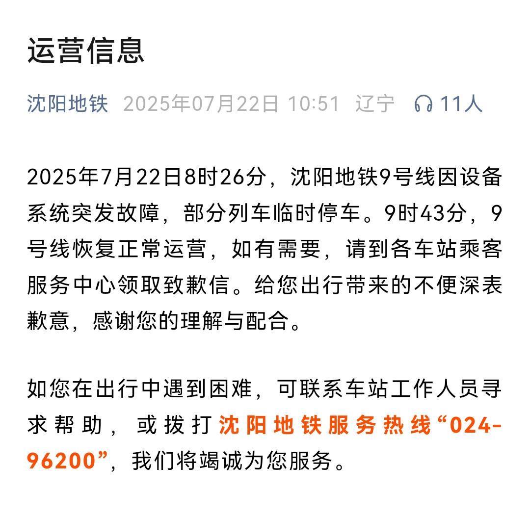 沈阳地铁此前发布运营信息称,2025年7月22日8时26分,沈阳地铁9号线因设备系统突发故障,部分列车临时停车。9时43分,9号线恢复正常运营,如有需要,请到各车站乘客服务中心领取致歉信。