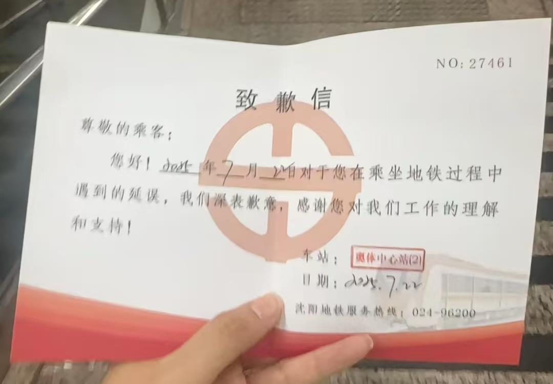 另有网友告诉极目新闻记者,当天上午他乘坐9号线时,列车在奥体中心站进站后,车厢内电子屏幕的信息显示:“列车因故临时停车,延误5分钟以内,请耐心等待。”最终,该网友在客服中心领到了致歉信。该致歉信内容显示:尊敬的乘客,您好,2025年7月22日对于乘坐地铁过程中遇到的延误,沈阳地铁深表歉意。