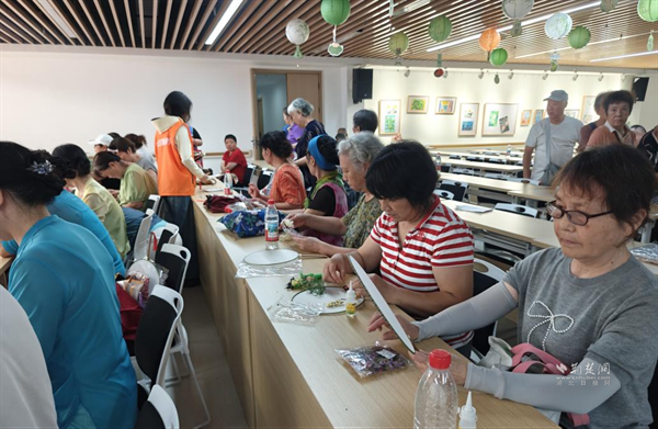 手工制作区与游戏互动区同步展开。手工区里,老人们挑选绢花、搭配蝴蝶结与亮片,将创意融入扇面设计,经过挑选、粘贴等步骤,一把把各具特色的手工扇陆续诞生。另一侧,洗手液、食用盐等实用奖品整齐排列,老人们积极排队投入到各项游戏中,欢笑声、助威声此起彼伏。