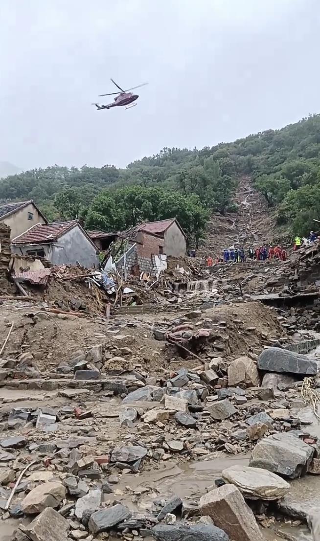 石屋子村村民拍摄的现场画面显示,村内多处山间房屋已被冲毁,遍地是乱石和杂物,有村民家中满是淤泥。直升机在村子上空盘旋,多名救援人员正在开展搜救等相关工作。