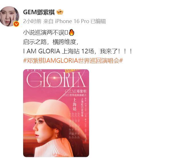 7月22日,歌手邓紫棋在社交平台上发文:“I AM GLORIA 上海站 12场,我来了!”演出地点是上海虹口足球场,日期为2025年8月29-31日,9月5-7日、12-14日、19-21日。