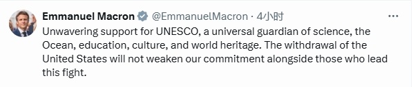 法国总统马克龙22日在社交媒体上发文,表达对联合国教科文组织“坚定不移的支持”。他说,联合国教科文组织是科学、海洋、教育、文化和世界遗产的全球性保护者。
