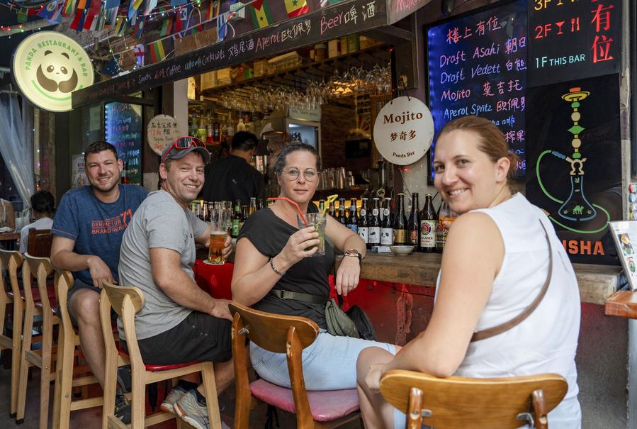 Tourists from Austria have drinks at a bar in Tianzifang art area in Shanghai, east China, July 21, 2025. (Photo by Zhang Yue/Xinhua)