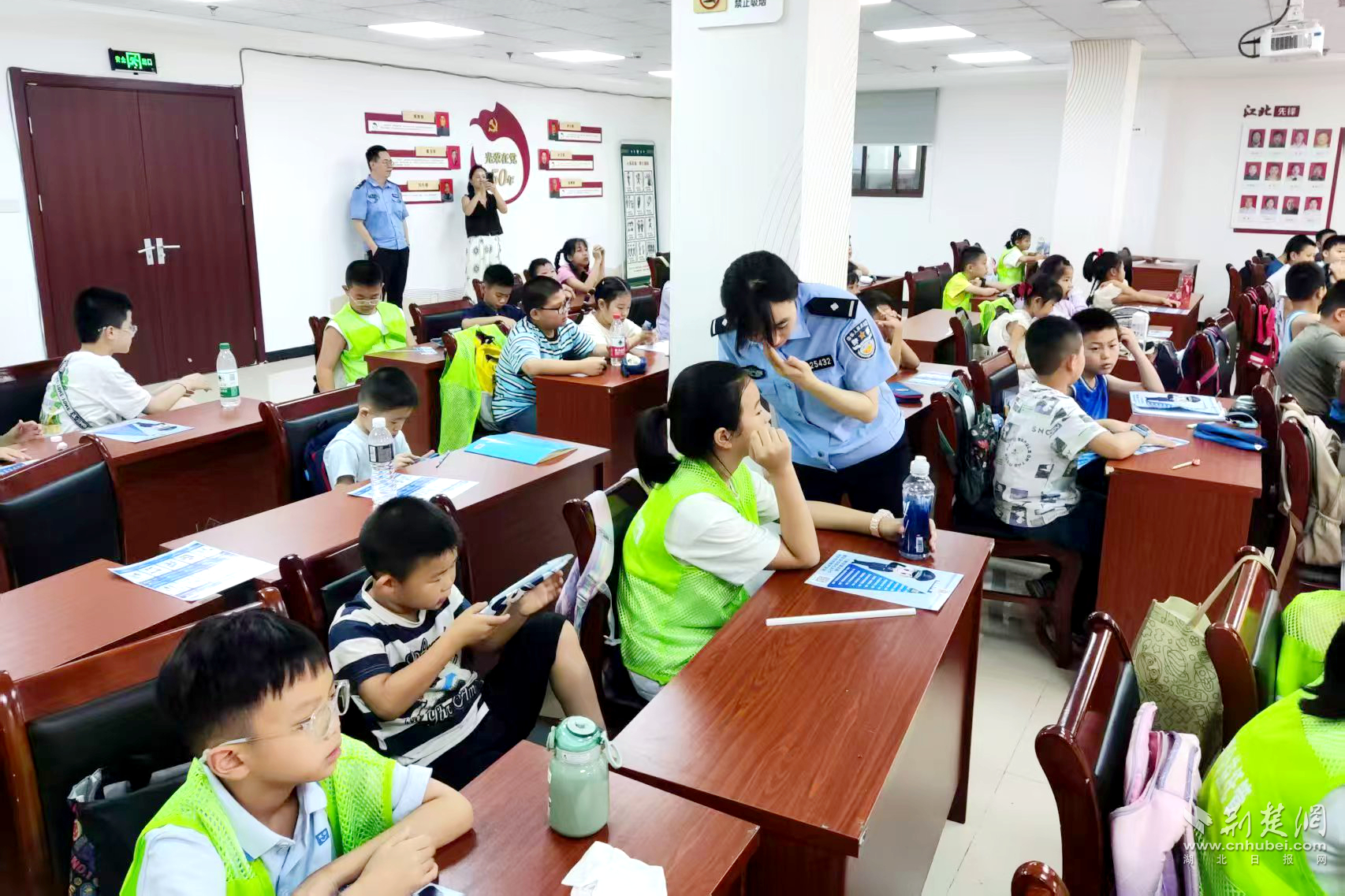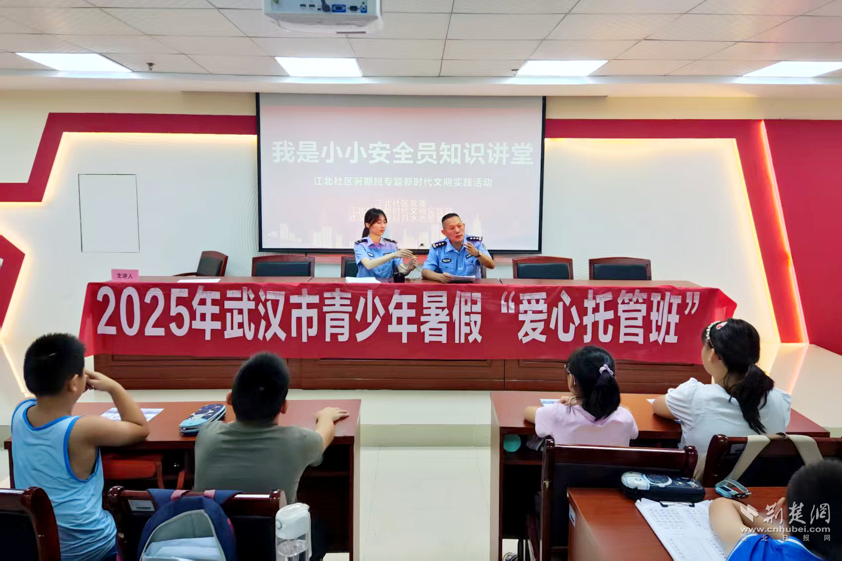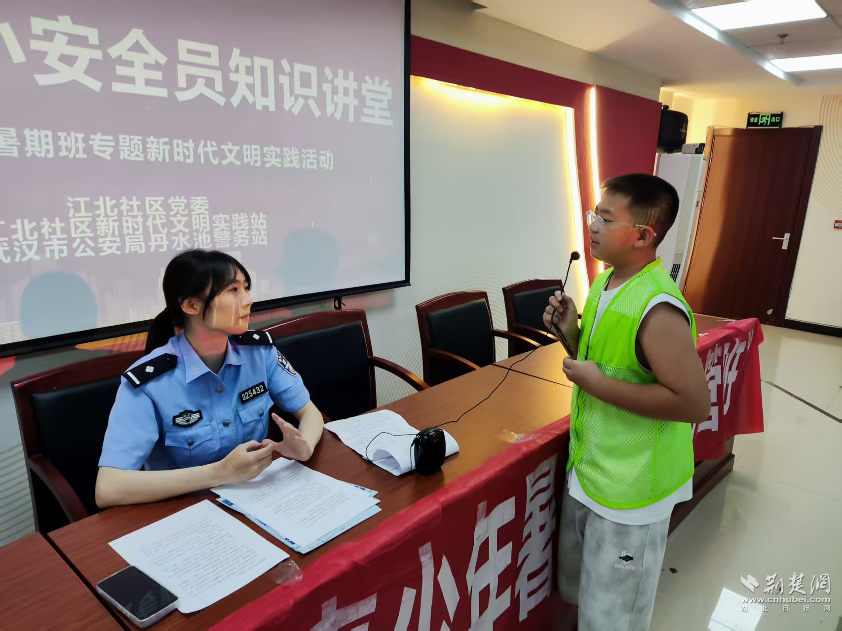 荆楚网(湖北日报网)讯(记者 白云 实习生 潘妍 通讯员 刘源 吴逸飞)7月22日上午10点,武汉市公安局江岸分局丹水池街派出所联合江北社区共同开展了“青春护航·平安暑期”主题安全教育课堂,为辖区内的中小学生们送上了一份实用的“安全大礼包”,助力孩子们度过一个安全、愉快的暑假。