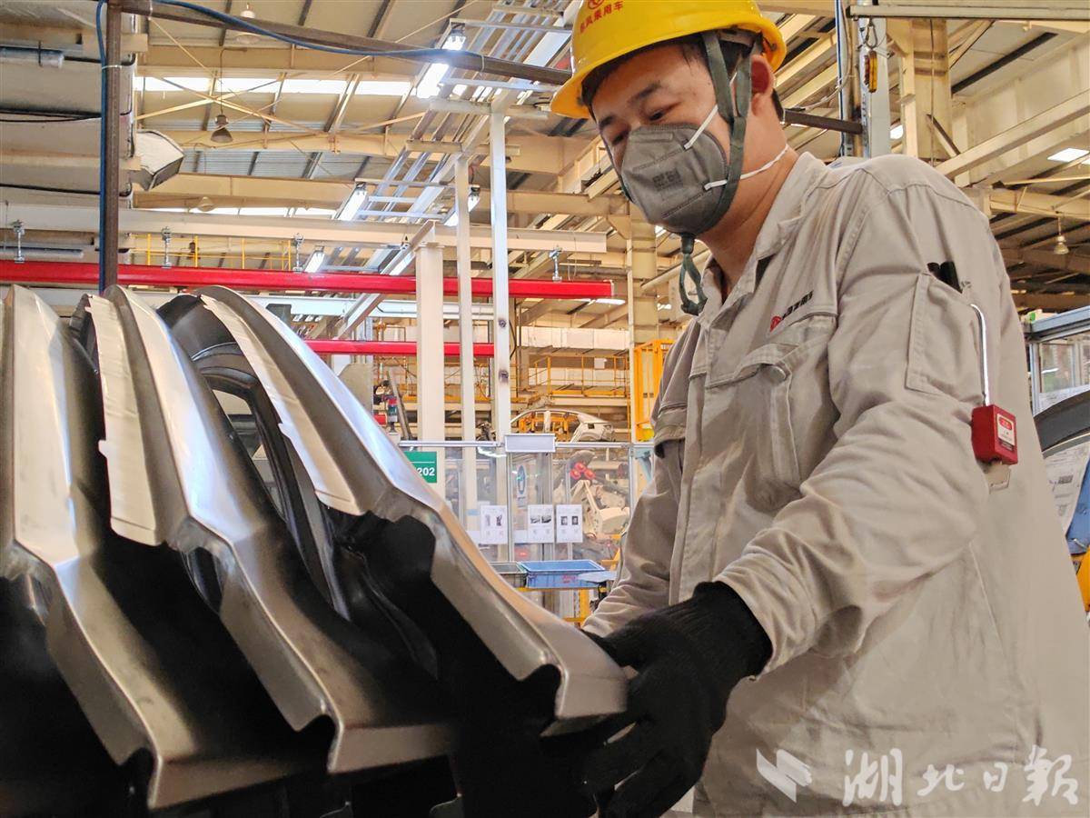 刘亮正在搬运汽车侧围板。(湖北日报全媒记者左晨摄)
