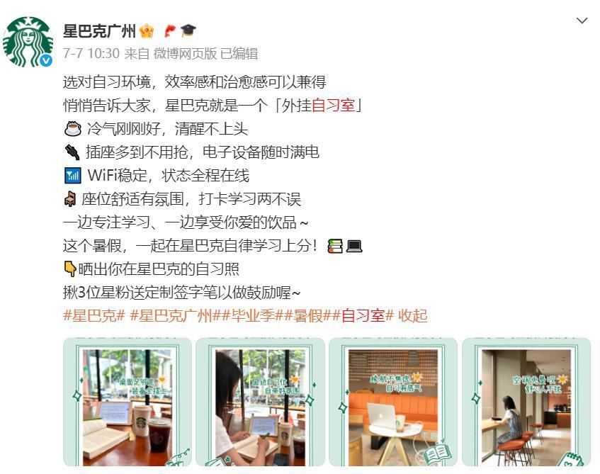 记者发现,早在7月7日,星巴克广州微博就曾发文宣传自习室,鼓励大家晒出自习照。