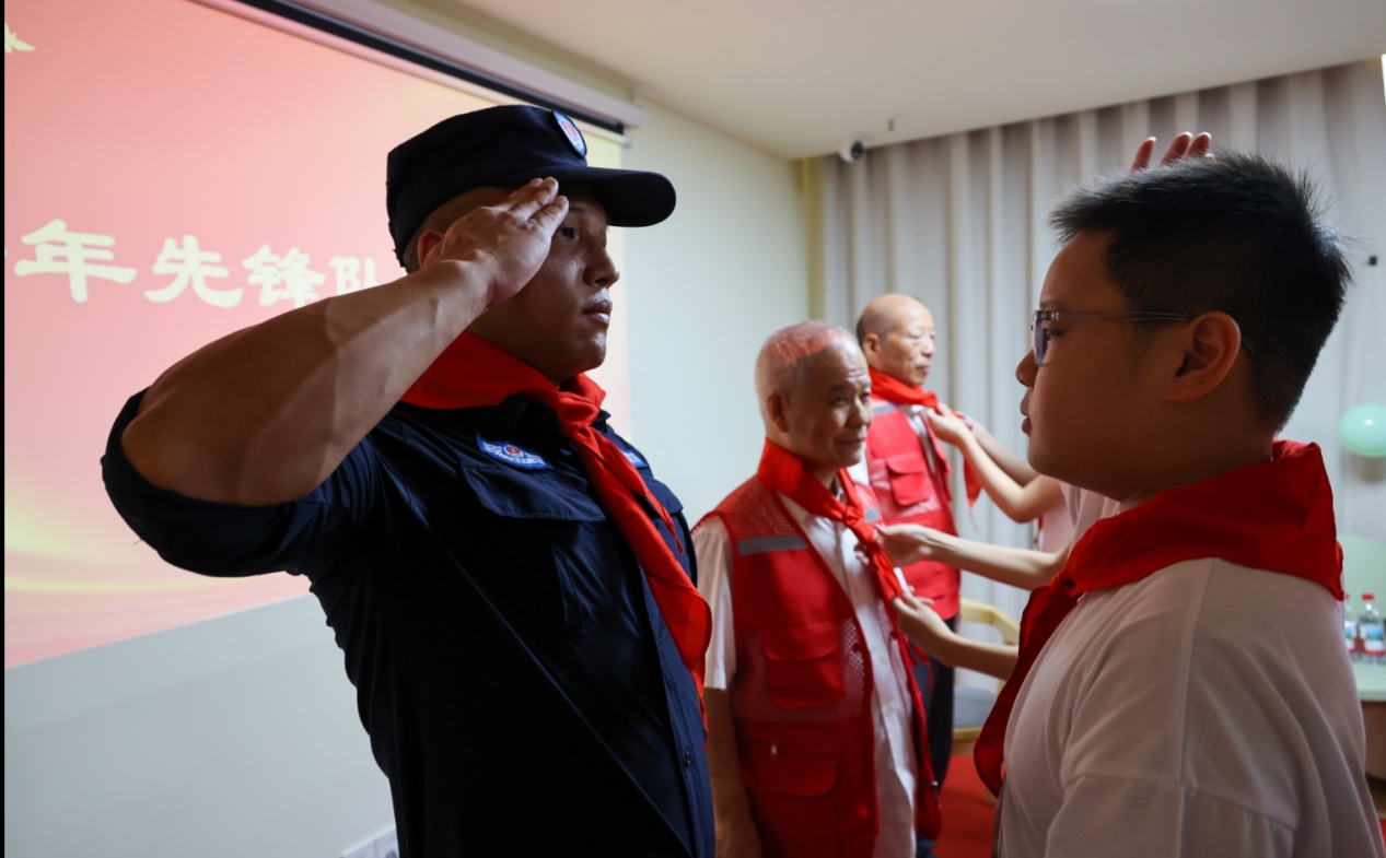 老兵代表分享结束后,东湖社区少先队员为老兵代表献花、佩戴红领巾,并齐唱《我们是共产主义接班人》。