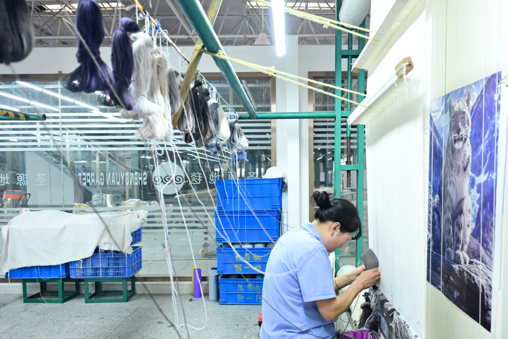 7月21日,圣源地毯集团有限公司车间内,工人正在织藏毯。新华社记者 齐芷玥 摄
