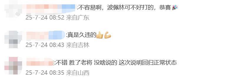 这场比赛中,吴易昺出手迅速、落点精确的正手击球让人惊艳,连波普林也大感震惊,好几次盯着落点摇头感叹。此外,吴易昺在体能下降时仍拼尽全力坚持下去的比赛态度,也同样令人印象深刻,更赢得球迷们的集体点赞。