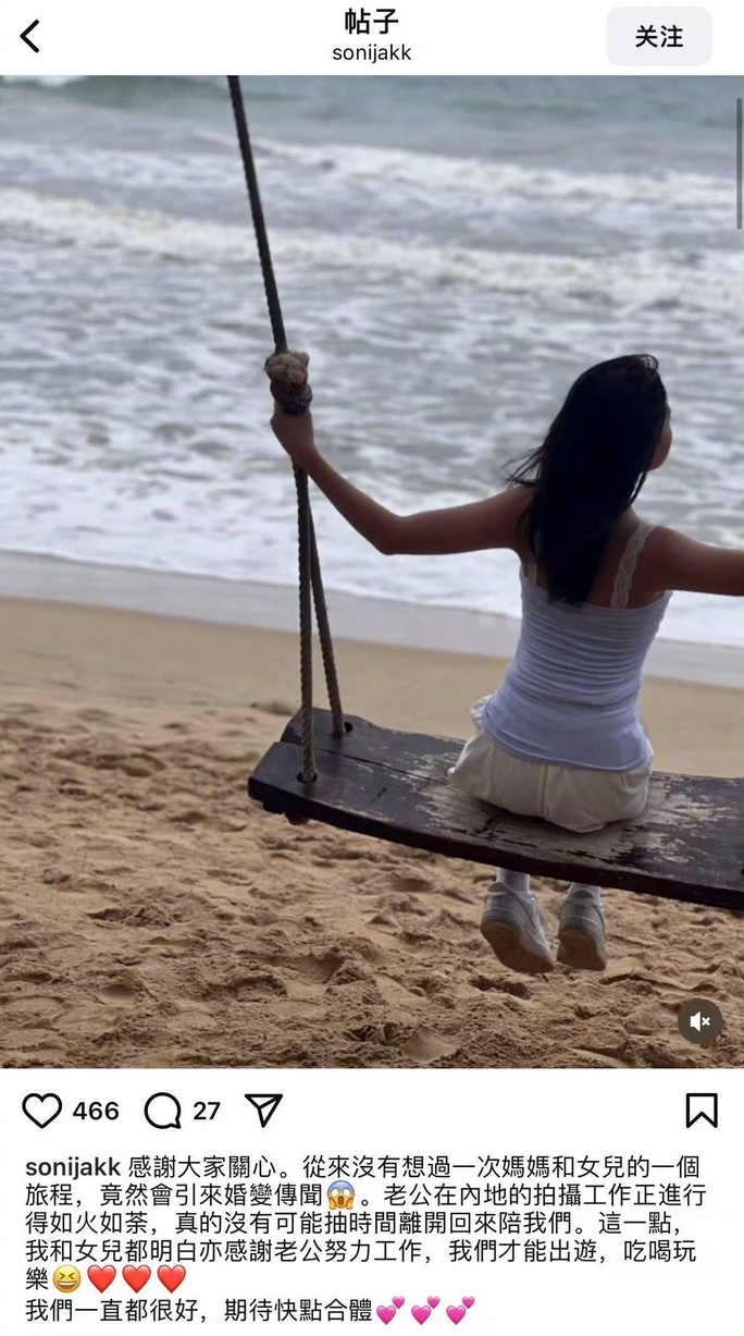 她表示:“感谢大家关心。从来没有想过一次妈妈和女儿的一个旅程,竟然会引来婚变传闻。老公在内地的拍摄工作正进行得如火如荼,真的没有可能抽时间离开回来陪我们。这一点,我和女儿都明白亦感谢老公努力工作,我们才能出游,吃喝玩乐。我们一直都很好,期待快点合体。”