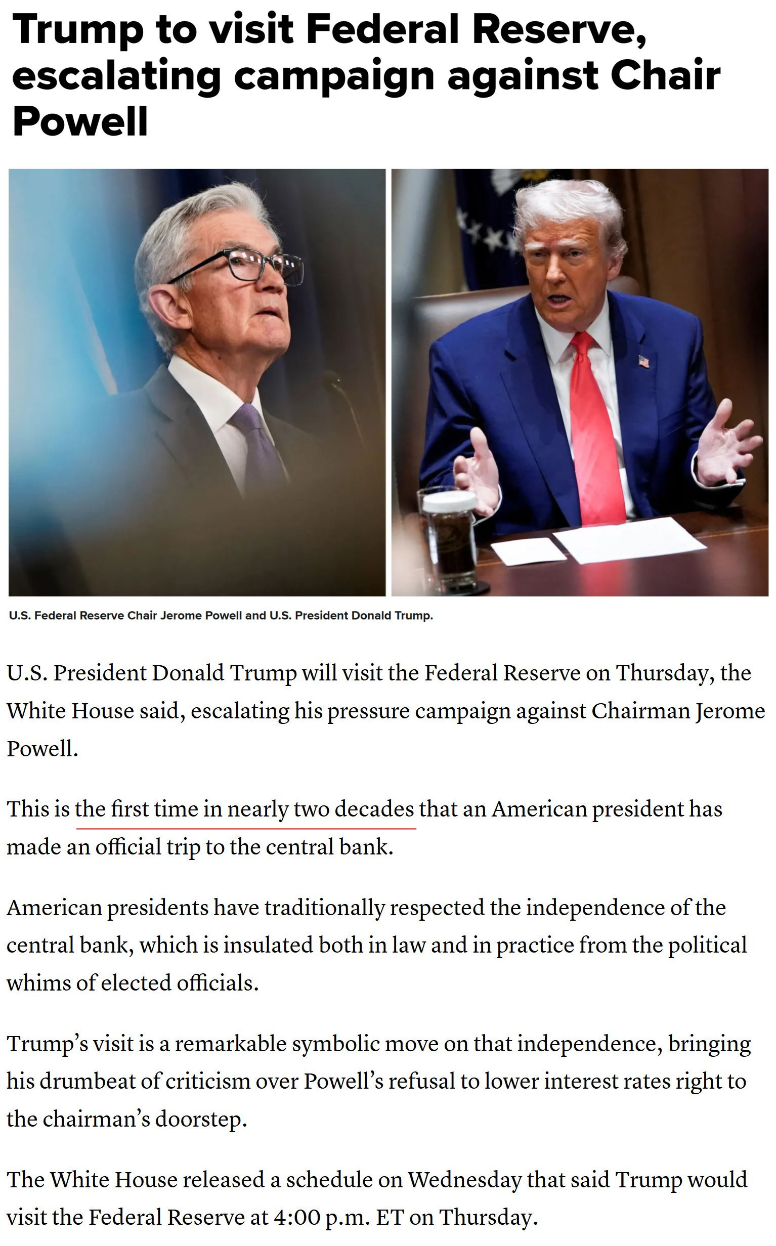 随后白宫发布消息称,特朗普计划于美国东部时间24日下午16时(北京时间25日4时)亲自到访美联储总部。