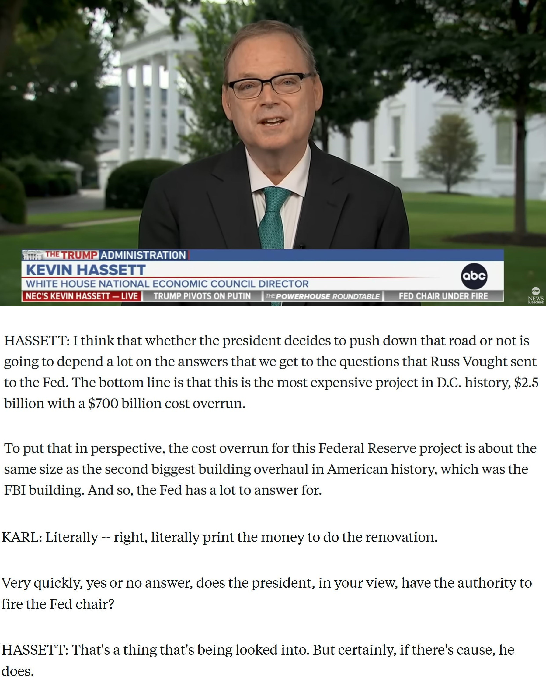 哈西特:“这件事正在研究中,但可以肯定的是,如果有理由,总统有权这么做。”