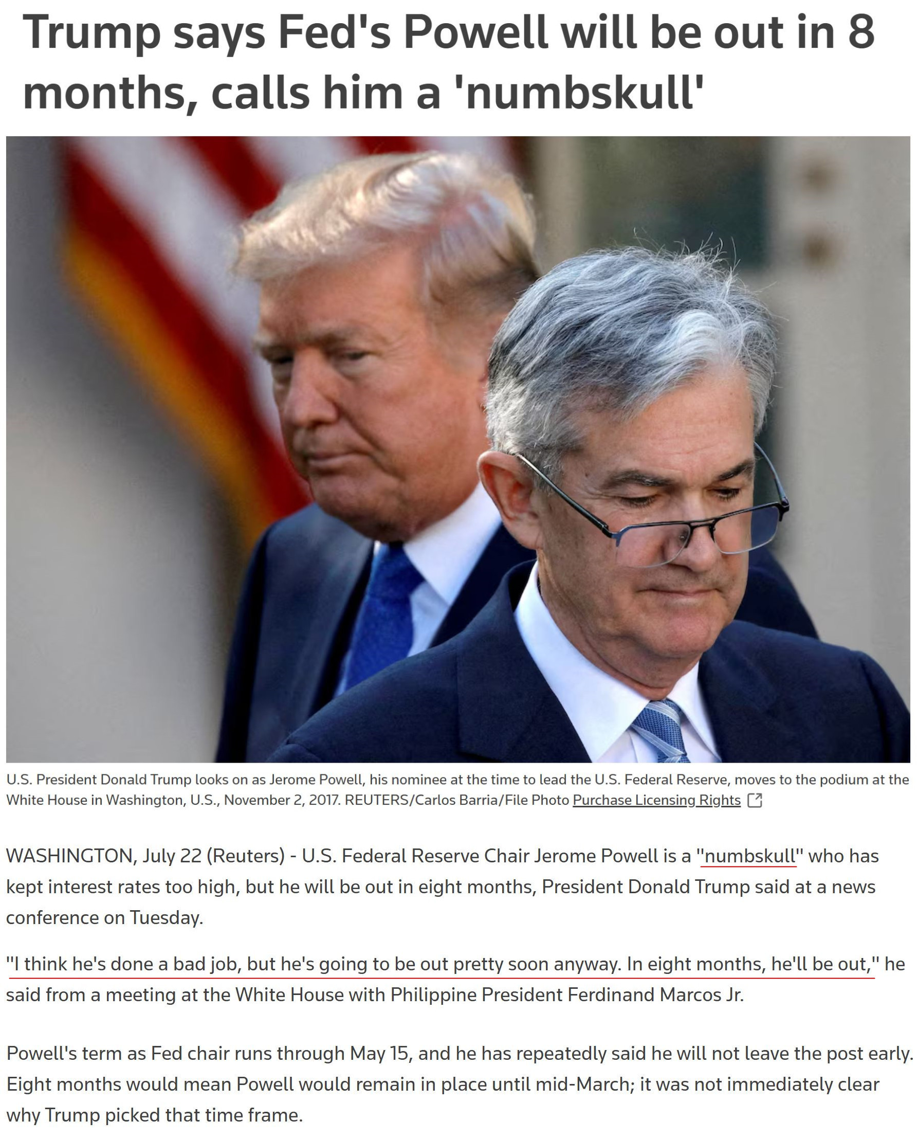 路透社报道称,鲍威尔的美联储主席任期原本将于明年5月15日到期,他本人也一再表示不会提前离职。而特朗普口中的八个月则意味着鲍威尔将留任到明年3月中旬。