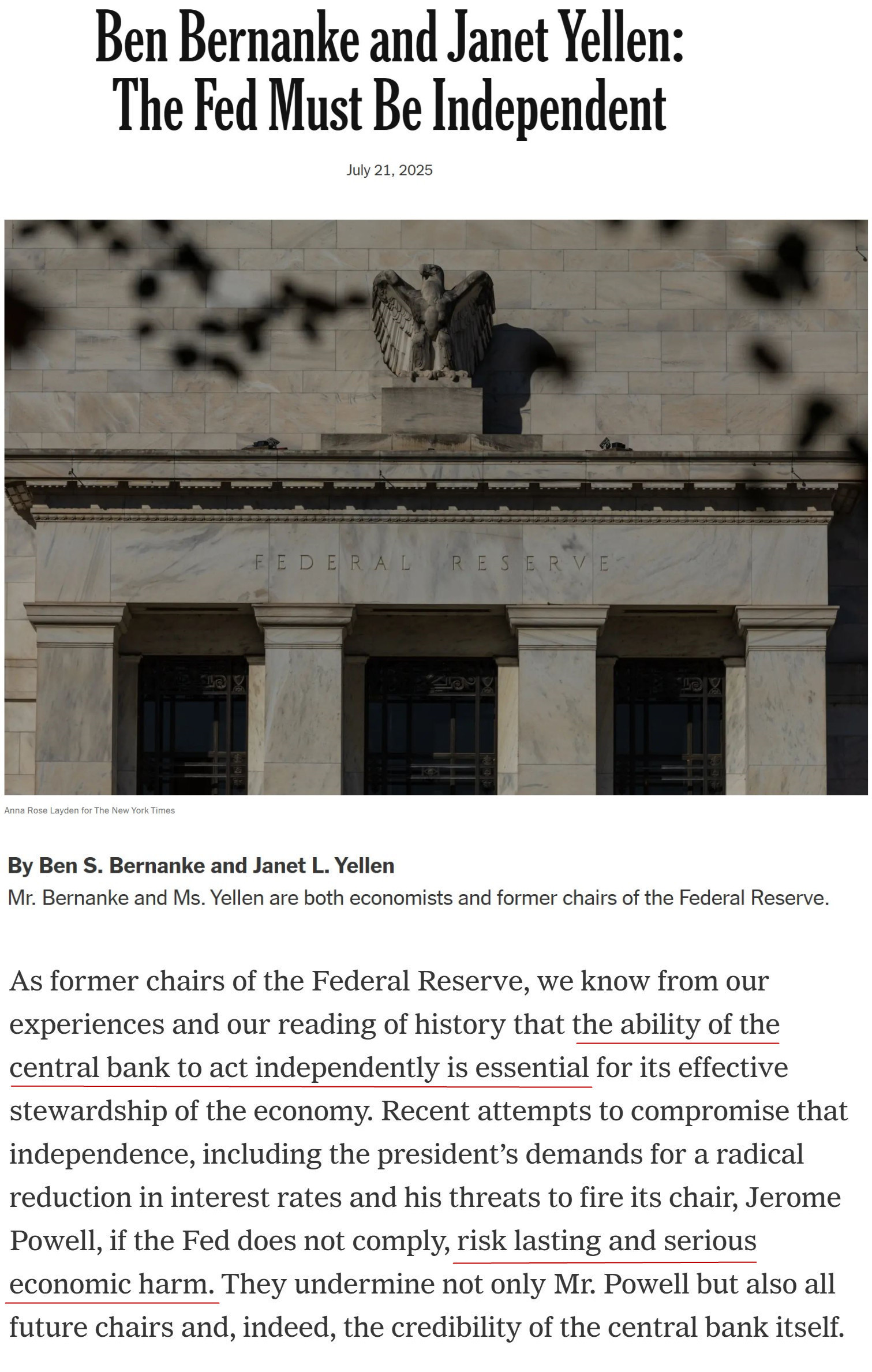 两人近日在《纽约时报》上联合撰文指出,近期白宫要求美联储大幅降息并威胁解雇现任主席鲍威尔的举动正在削弱美联储的信誉,损害美联储的独立性,会对美国经济造成“持久且严重”的影响。