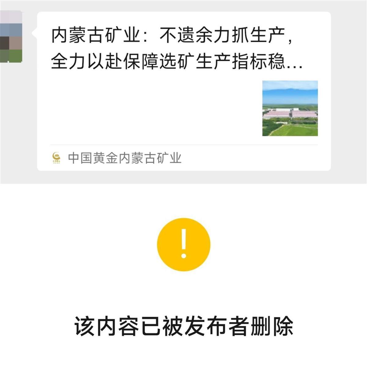 另外,7月8日,上述官微发布的文章《内蒙古矿业:不遗余力抓生产,全力以赴保障选矿生产指标稳定攀升》也删除了。