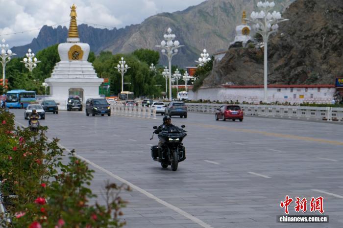 7月21日,一位骑士骑着重型摩托车途经拉萨北京中路白塔附近。中新社记者 江飞波 摄