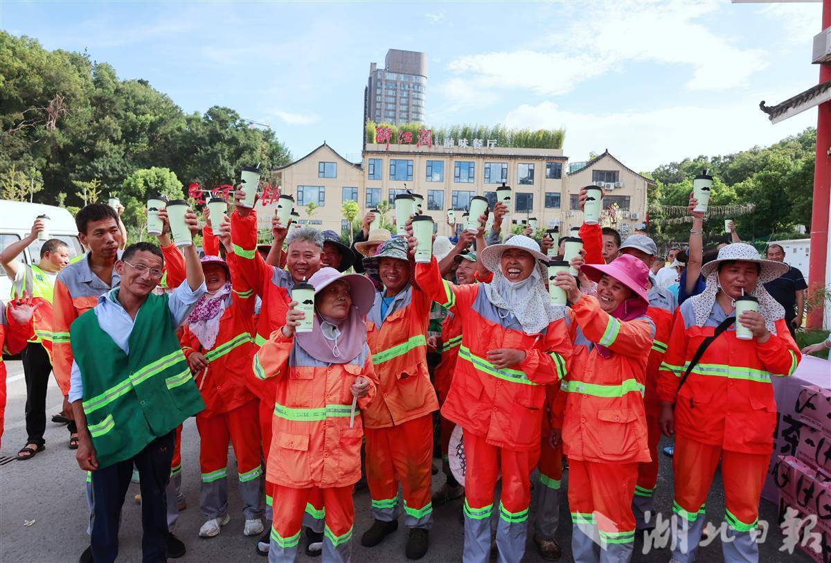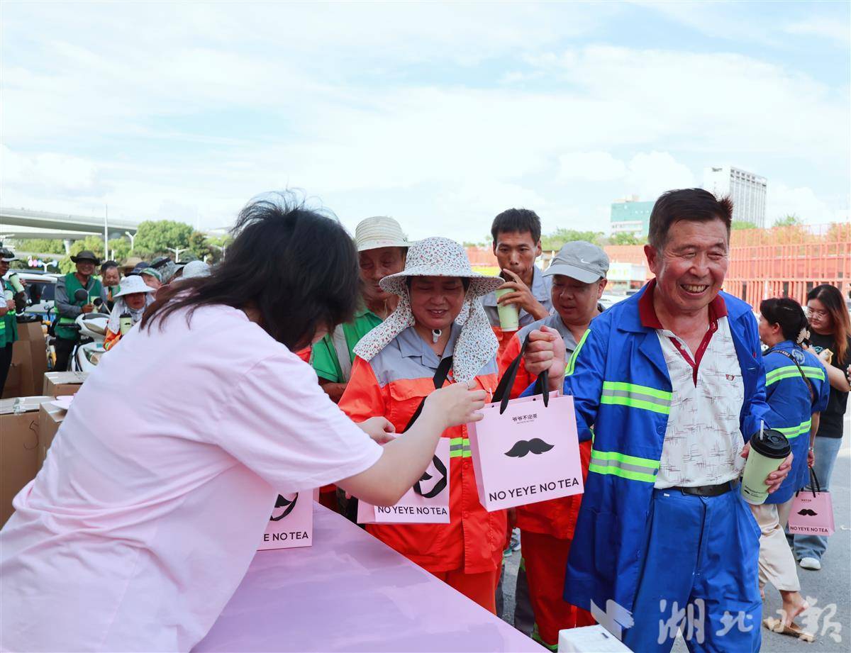 当天下午,在洪山区卓刀泉南路,环卫工人们有条不紊地进行着巡回保洁工作,汗水浸湿了他们的衣衫。此时,一杯杯冰凉清爽的奶茶递到环卫工人手中,接过奶茶的高师傅脸上露出朴实的笑容,连连道谢:“太感谢了,这么热的天还想着我们,这杯奶茶真好喝!”