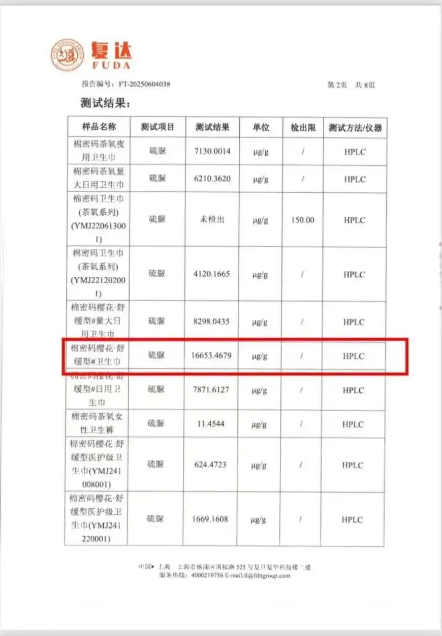 卫生巾新国标实施不到一个月,又有品牌“塌房”。主播辛巴自创的“棉密码”卫生巾被曝检出超高含量的致癌物硫脲,其中一款棉密码樱花·舒缓型卫生巾的硫脲含量高达16653.4679μg/g。