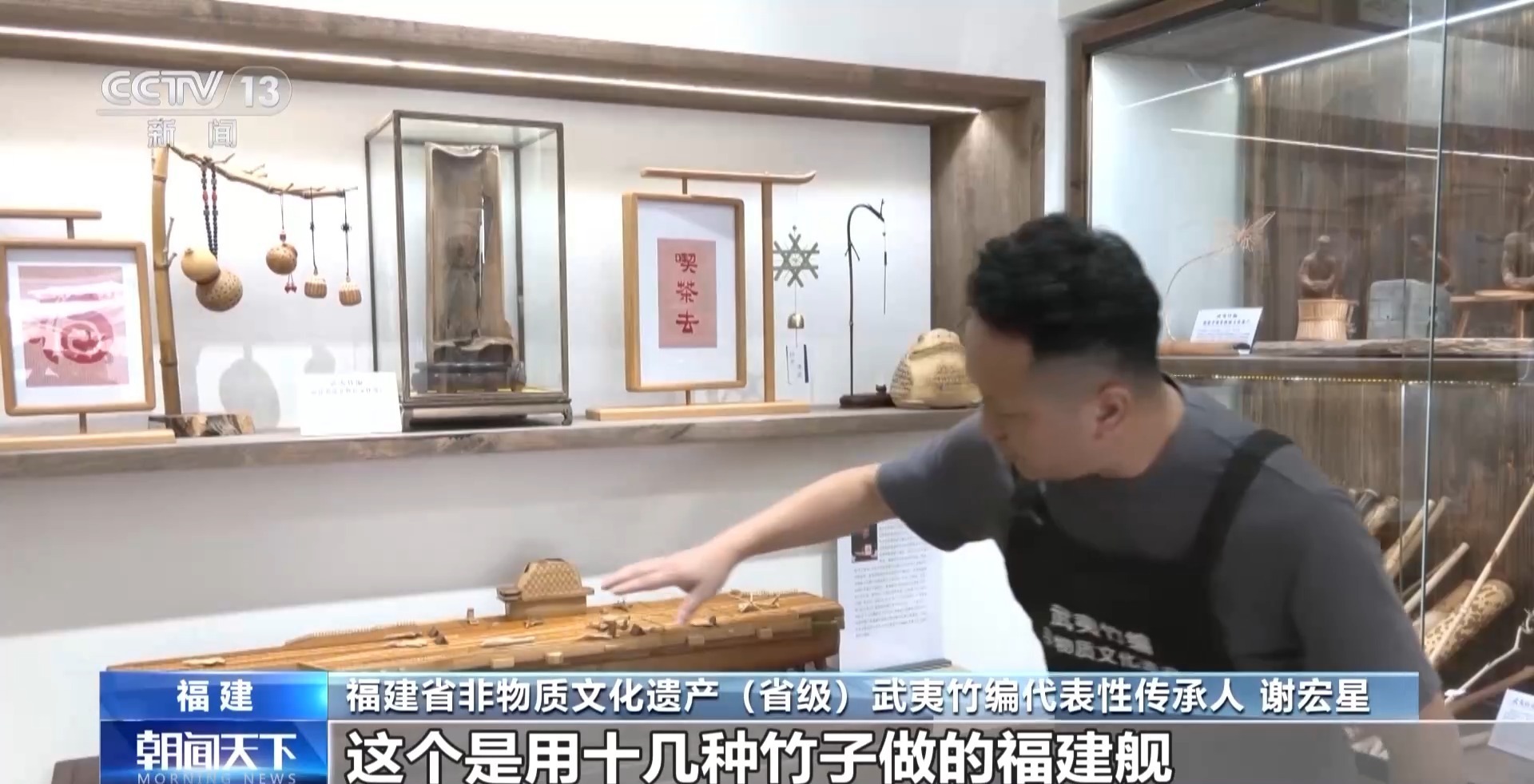 福建省非物质文化遗产(省级)武夷竹编代表性传承人 谢宏星:这个是用十几种竹子做的福建舰。我们用武夷山传统的技艺,包括一些原材料,做一个当代的艺术品。